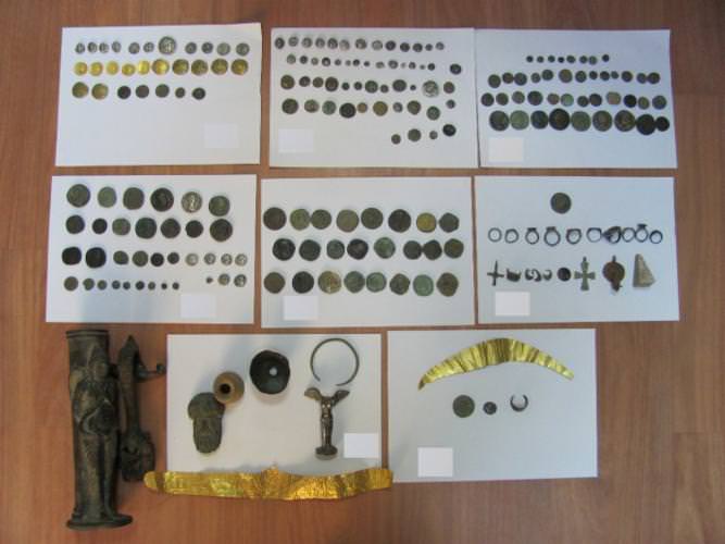 Menemen ilçesinde Klasik, Hellenistik, Roma ve Bizans dönemlerine ait 184 sikkenin de bulunduğu 215 parça tarihi eser ele geçirildi, 1 kişi gözaltına alındı.